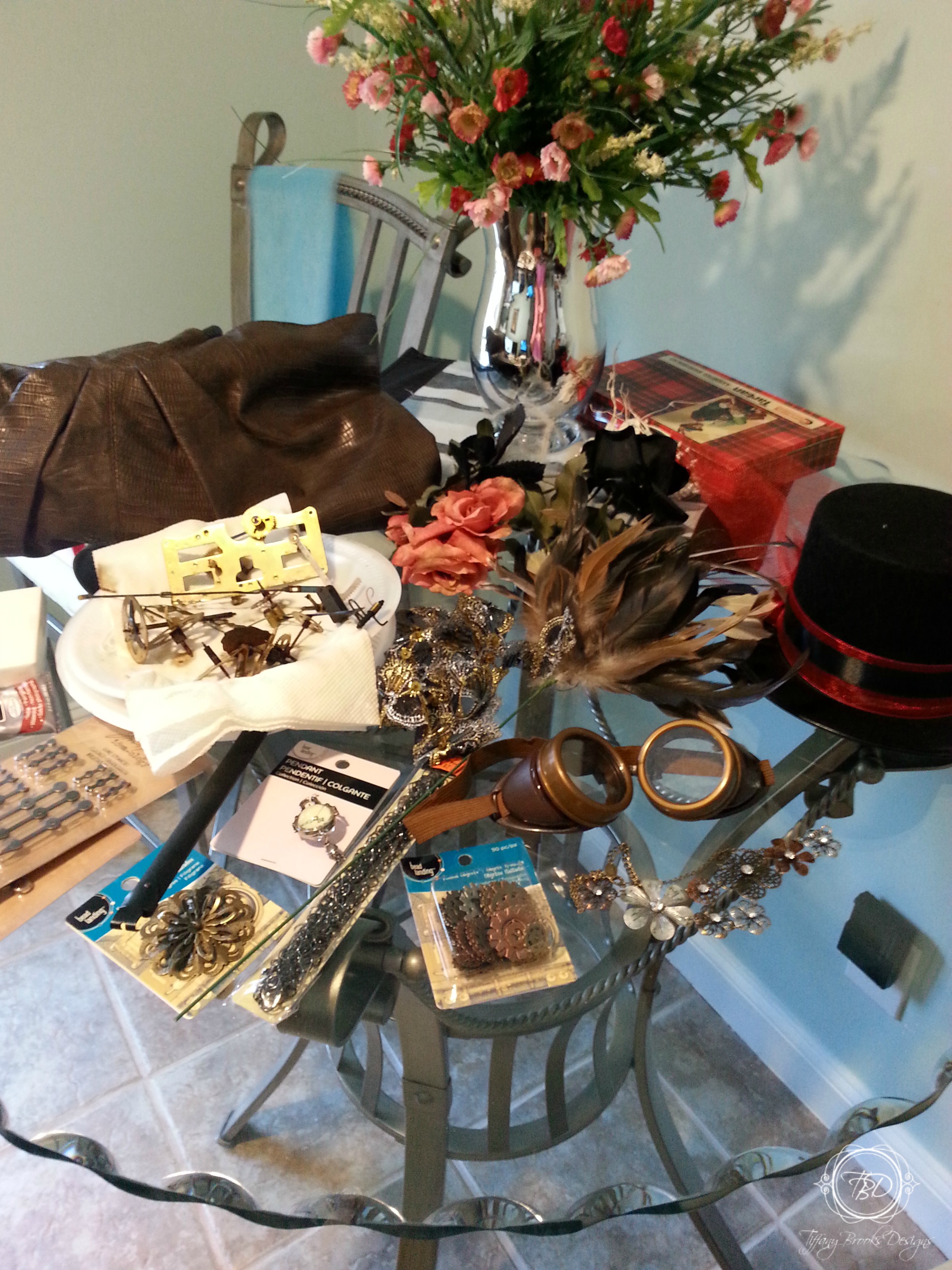 I first had to decide what did I want on my hat. Most steampunk hat’s I have seen on the internet had goggles on the hat and I wanted to do something different.