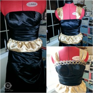 The corset top took a little more time than the skirt as there were several things that had to be added. I first added a separating zipper to the back of the top. I then added a gathered brocade trim to the bottom of my top to add a little extra length. I added matching straps to ensure I would be comfortable in my costume throughout the entire festival. Finally, I added a sequin and beaded trim to the top of the corset to add just a little more height to the top.