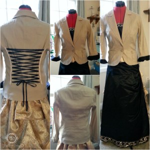 Now I am finished with my main steampunk costume but I need a jacket. So back to my closet for something else that can be recycled. As I had hoped, I found the perfect jacket that I haven’t worn in years. First I shortened the sleeves to 3/4 and added a pleated black polyester trim. Even with the shortened sleeves and black trim, the jacket was still a little too plain for the rest of my costume. By adding elastic bridal button tape down two seams on the back of the jacket, I was able to give the jacket a lace up corset look. Now this completes the jacket.