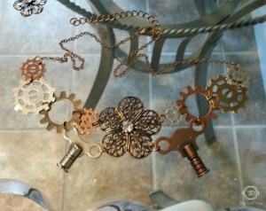 Utilizing needle nose pliers, I was able to careful take apart the old necklace and add gears and clock keys I bought at Michaels Craft Store.