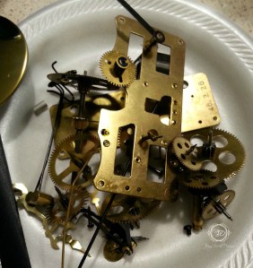 I looked at several craft stores for gears but not many carried real looking gears. So my next option was to take apart an old clock that was in the closet. After removing all of the gears from the clock, I realized they needed to be slightly tarnished. In order to slightly tarnish the gears, I dipped them in apple cider vinegar a few times and allowed to air dry in between dipping.