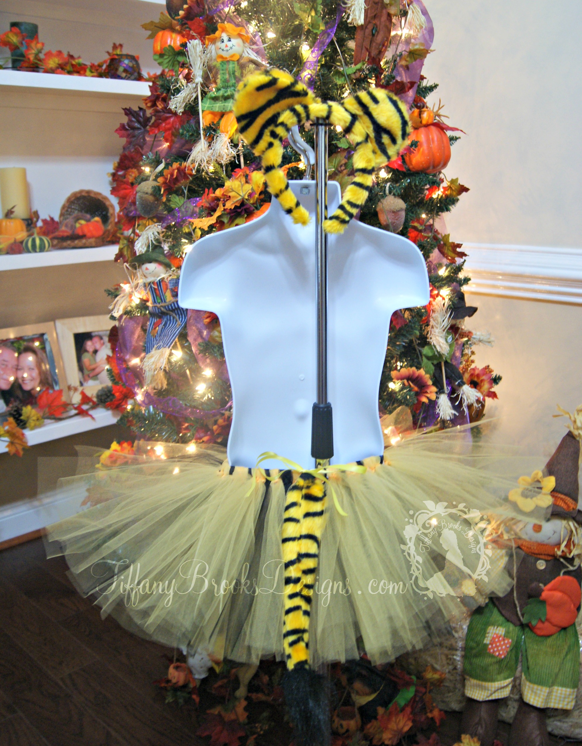 Tiger tutu features yards and yards of golden yellow and black tulle on an elastic waist band. Set includes tiger tail and head band that makes tiger sounds when you squeeze the ear. Tail is tied on to tutu with yellow satin ribbon for easy removal.