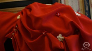 I was able to find a red peachskin locally along with all of the accents needed for the waist and for the pick ups. I purchased red and off white rose accents for the pick ups and the waist and I was able to find off white pearls to utilize as additional accents around the dress waist.