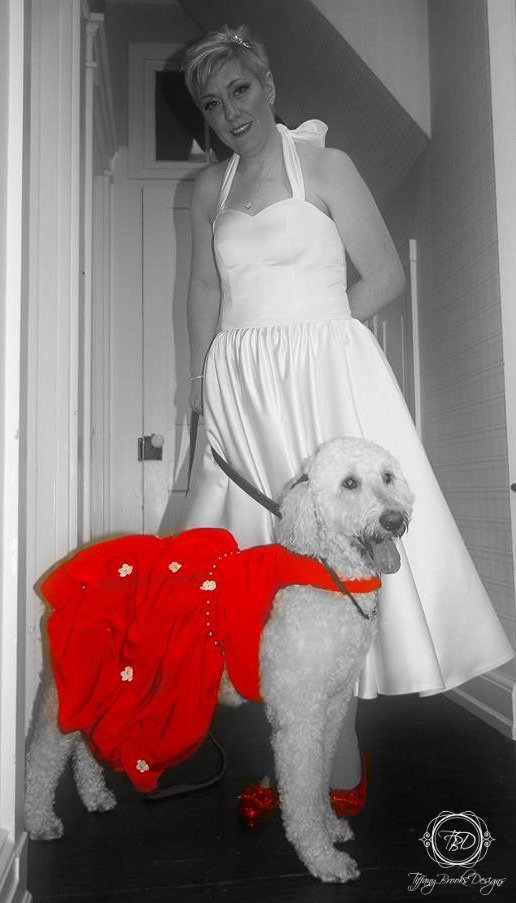 Ms. Hildy and Her Custom Couture Dog Dress with Pick Ups