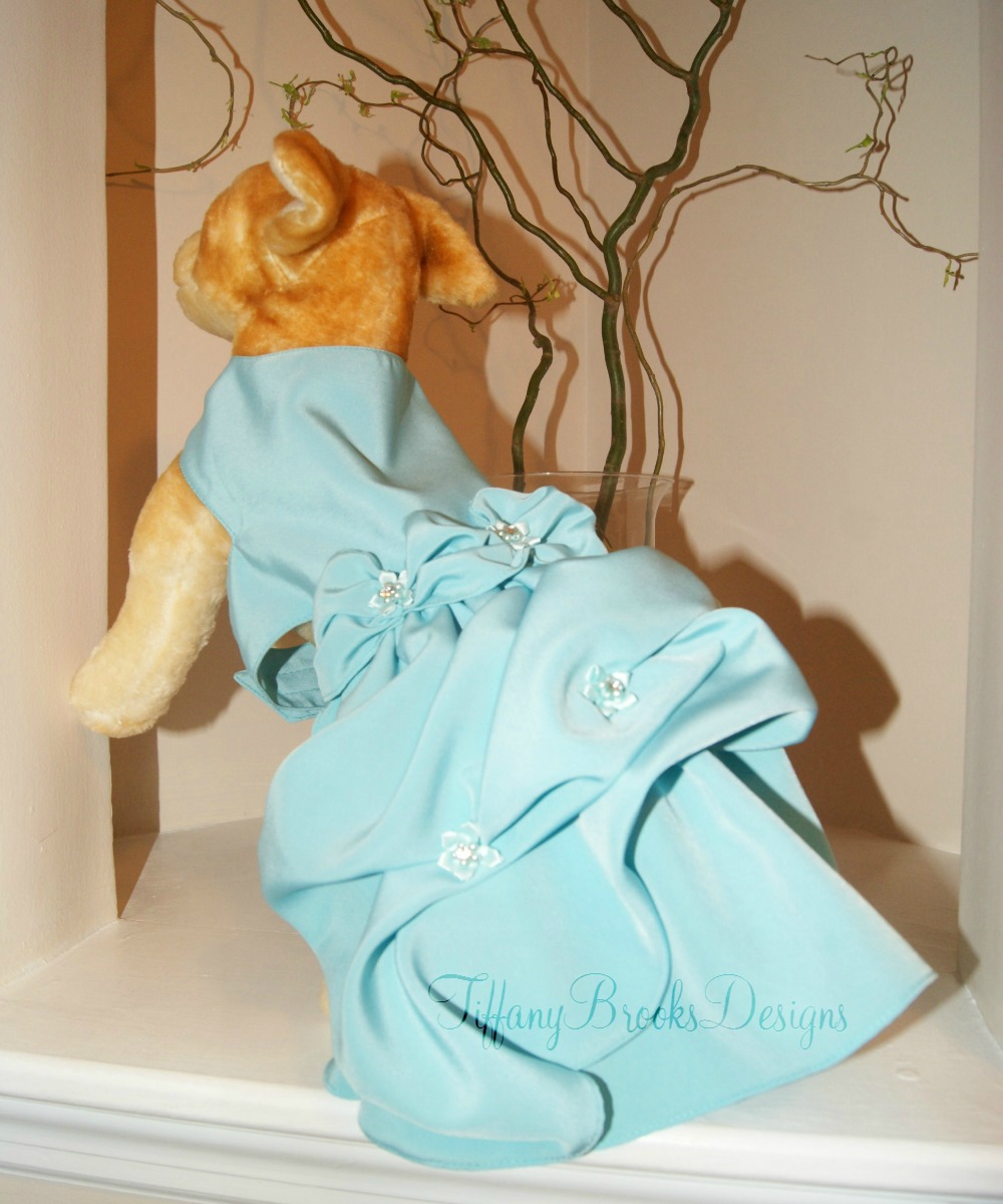 My most recent custom order was for a very cute Golden Doodle named Hildy. While Hildy’s owner was searching Etsy, she found my listing for an Angel Blue Peachskin Couture Dog Dress with pick ups. She instantly inquired about getting a similar couture dog dress custom made for Hildy.
